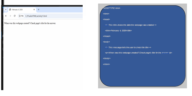 Create a webpage that prints the message “When was this webpage created? Check page’s title for the answer.” to the screen, and set the title of the page to the current date.