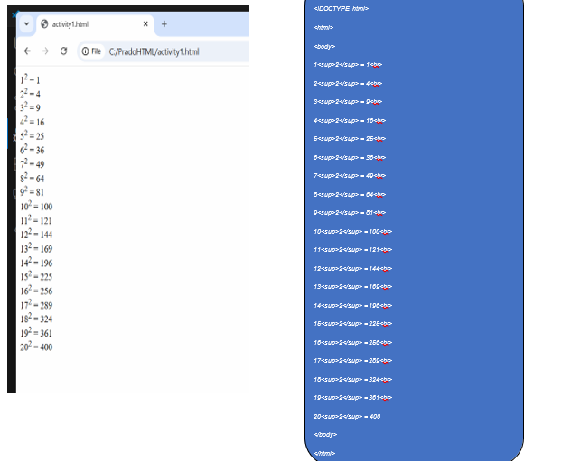 Print the squares of the numbers 1 – 20. Each number should be on a separate line, next to it the number 2 superscripted, an equal sign and the result. (Example: 102 = 100)