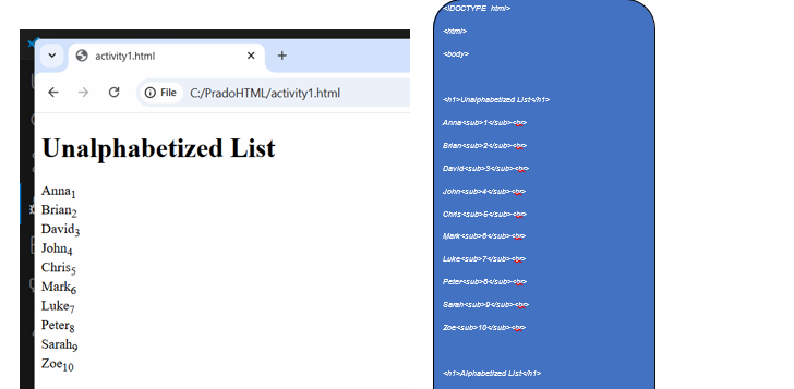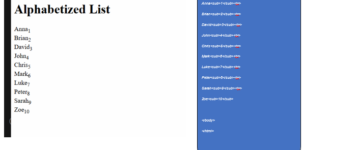 Prints 10 names with a line break between each name. The list should be alphabetized, and to do this place a subscripted number next to each name based on where it will go in the alphabetized list. (Example: Alan1). Print first, the unalphabetized list with a subscript number next to each name, then the alphabetized list. Both lists should have an <h1> level heading.